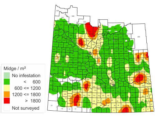 cocoons collected in fall soil samples in Alberta and Saskatchewan indicate a continued high risk of the pest in some areas. The wheat midge forecast maps show high risk where more than 1,200 larvae per square metre are indicated; infestations over 600 may still result in significant damage and yield loss if environmental conditions are favourable. Midge-tolerant varieties are available in red spring, durum and extra strong wheat classes and are used on an estimated onethird of Canada Western Red Spring wheat in Saskatchewan.