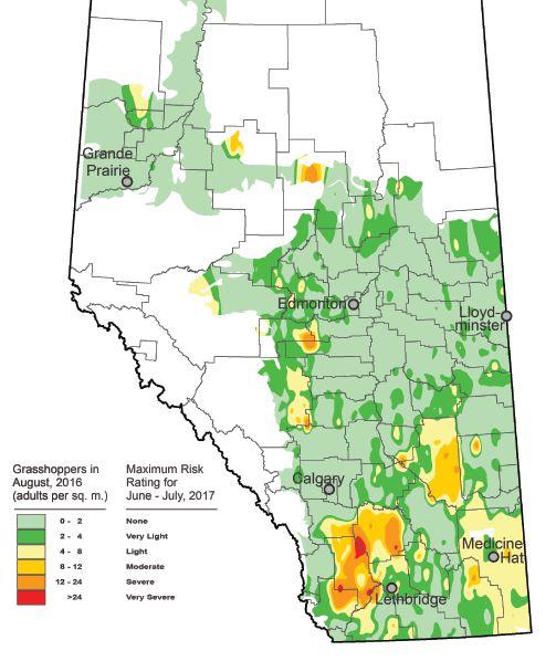 Grasshoppers were generally a minor concern across the Prairies in 2016. However, the dry spring that persisted in some areas has set up the potential for localized outbreaks in 2017. The 2017 grasshopper forecast map for Alberta shows areas west of Lethbridge have the highest risk, and Meers says if the spring is dry in these areas, growers should be scouting fields.