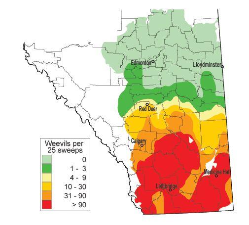 was present in a larger area than in 2015, expanding dramatically northward into central Alberta. Pea leaf weevil is now established from southern Alberta through west-central Alberta, as far north as Sturgeon County, north of Edmonton. In 2016, the most severe damage was in areas southeast and northwest of Lethbridge and in central Alberta between Highway 2 and Highway 21, from Calgary to north of Lacombe. For any producers south of Highway 9 and along Highway 2 up to Edmonton, there is a risk of damaging levels of pea leaf weevil in 2017, Meers warns.