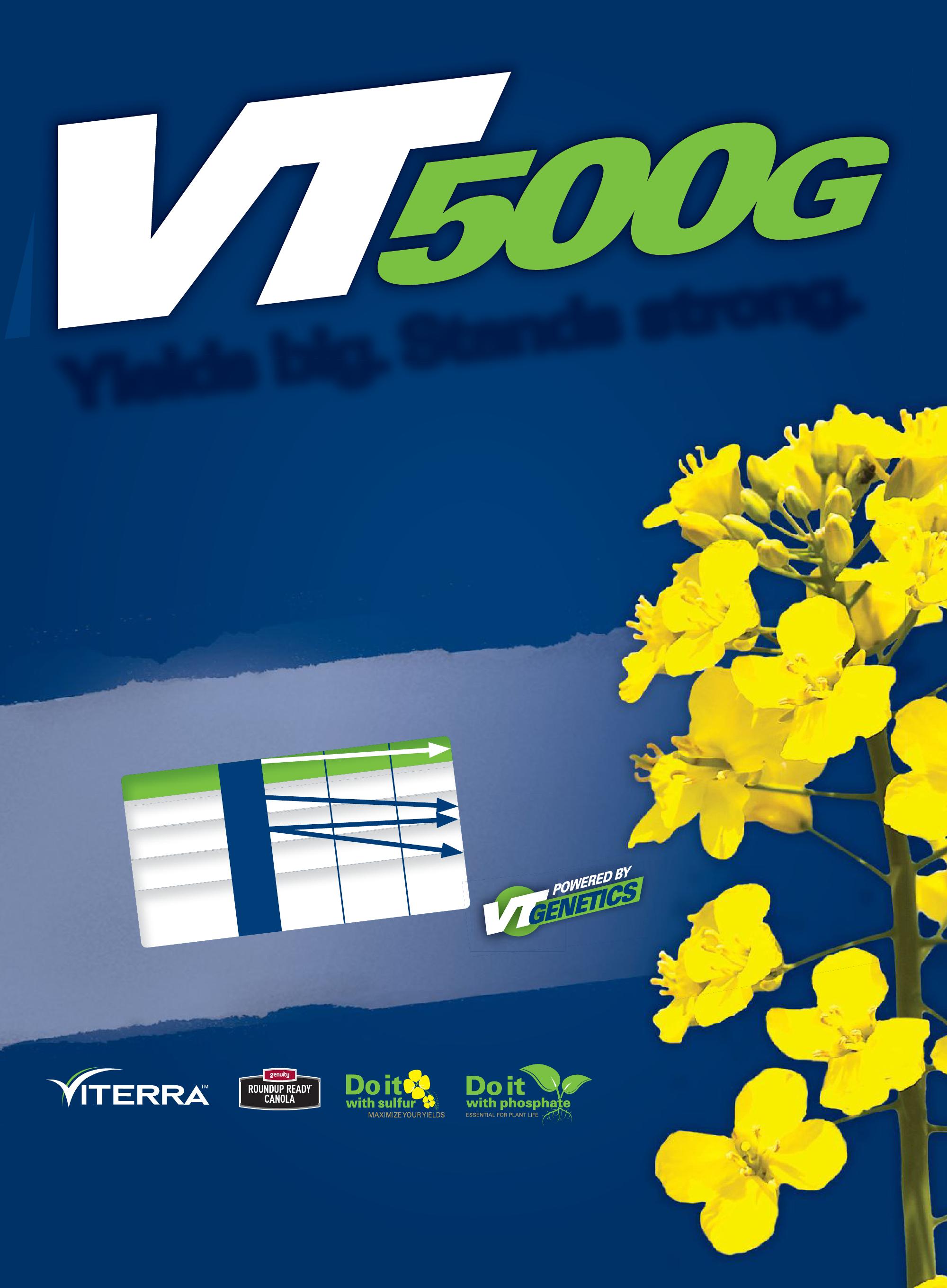 VT 500 G canola takes maximum nitrogen rates without lodging. This unique trait allows farmers to maximize fertility with confidence. Get the yield you’re looking for and swath it faster with VT 500 G. For more information, visit your Viterra ag