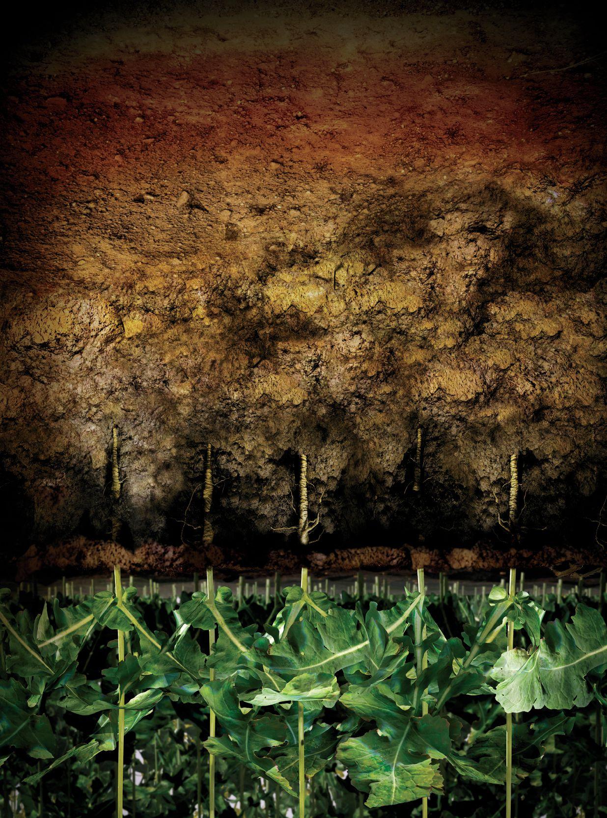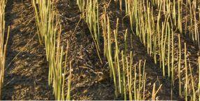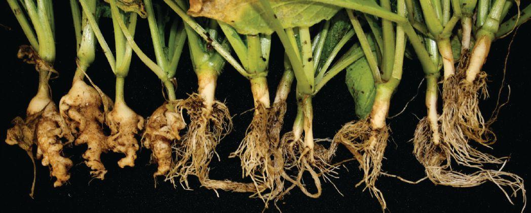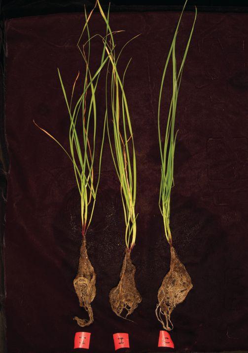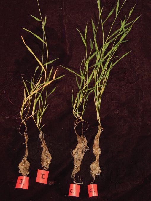 ABOVE: Lack of mycorrhizal colonization on flax roots was clearly evident on the canola stubble plots.
