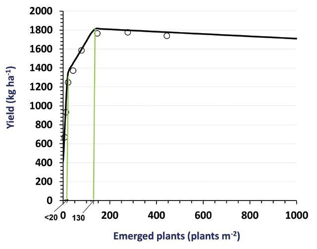 lower plant populations by branching out and podding more heavily. This is similar to Canola Council of Canada information that established plant densities ranging from four to 19 per square foot often result in similar yields. However, plant densities on the lower end have increased risk due to weed competition, insect pressure and moisture stress, and may also be later maturing.