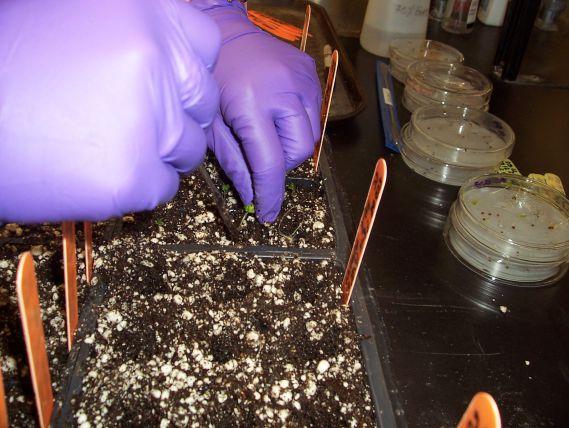 <LEFT: Clubroot pathotype testing is a laborious process. In this step, the inoculated seedlings are planted after their tiny roots have been dipped in a solution of purified clubroot resting spores of known concentration.