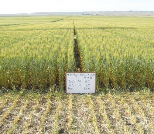 Hard Red Spring Wheat at High River, Alta., with ESN spring sidebanded at 60 kg N/ha versus ESN fall banded at 90 kg N/ha.
