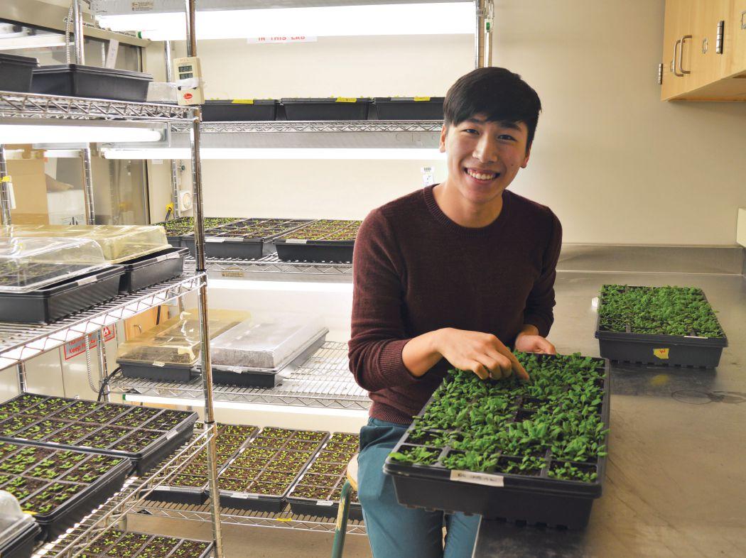 ABOVE: Kevin Ao, a graduate student at the University of British Columbia, studies plant immunity using CRISPR, a molecular tool that can be used to mutate specific genes. In the picture above, he points out a distinctly larger plant, which has mutations in two defense-related genes, amongst a population of CRISPRed plants.