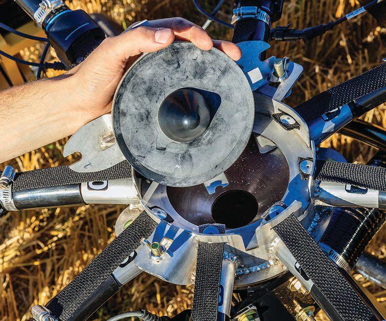 The second technology is called Tunable Towers located within the distribution manifold. After variance is identified, a centre-cone adjustment allows product and airflow to be balanced between rows. The towers can be adjusted to balance product distribution between the rows down to about 10 per cent –that’s five per cent above or below the target rate or a Coefficient of Variation of five per cent.