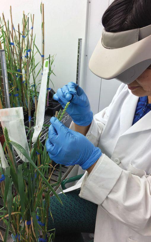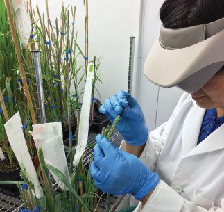 Bioriginal research scientist Hui Yang crosses wheat plants to develop lines with different starch properties, including a “stayfresh” line.