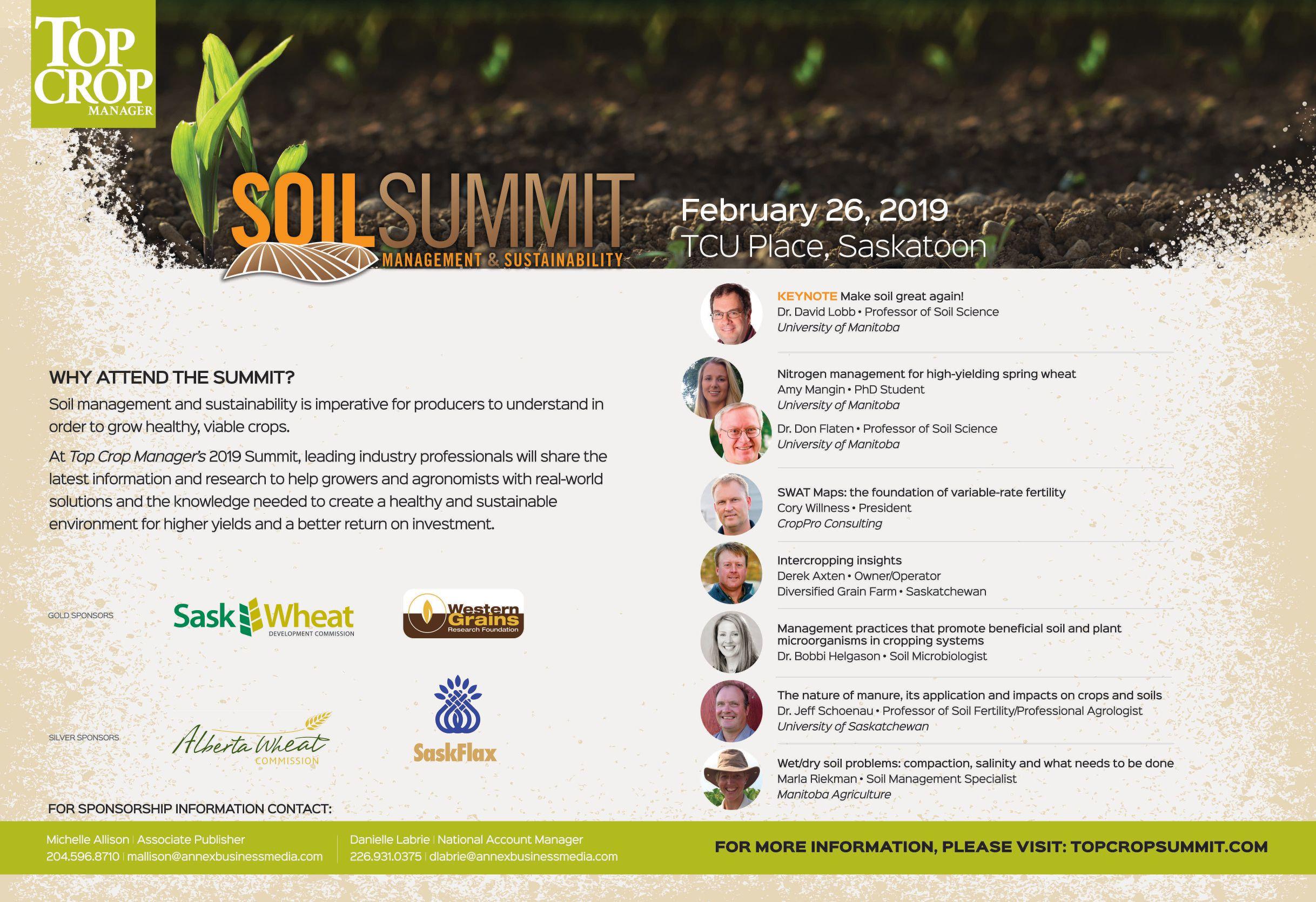 Finally, I’d be remiss not to mention the 2019 Soil Management and Sustainability Summit during a discussion about innovation. Our fourth research-focused event, Top Crop Manager’s annual summit gathers producers, agronomists, industry members and the scientific community together to share new research and ideas. We hope you’ll join us on Feb. 26, 2019 in Saskatoon.