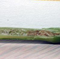 Spring wheat and durum are the primary host crops. The larva feeds on the developing pith inside of the plant stem, reducing crop yield and quality. As the plant matures, the larva moves to the base of the stem and cuts a V-shaped notch in the stem. These notched stems are prone to breakage and falling, making the grain unharvestable.