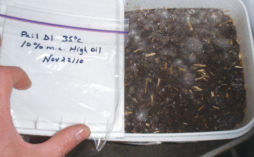 TOP AND ABOVE: In a phone survey in 2009, over a third of respondents said they had encountered a problem with canola spoilage in storage on their farms at some point over the years (top). Even though the PAMI researchers hadn’t detected heating in any of the samples, several samples were mouldy and had deteriorating oil quality after two months in the chambers (above).