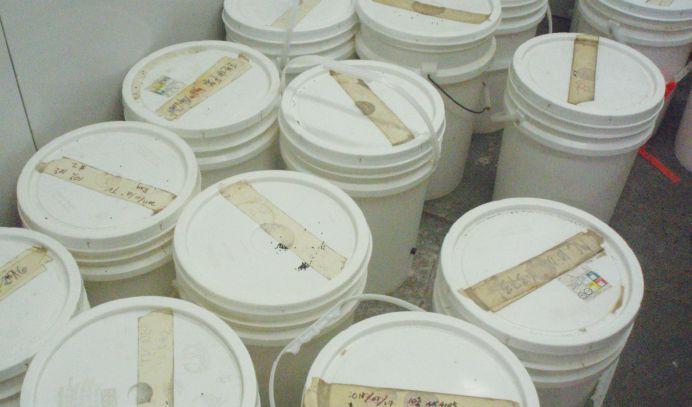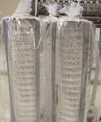 The Manitoba researchers used germination as one way to evaluate the degree of spoilage in the canola samples after storage. (The bags around the petri dishes were removed after four days, and germination counted after seven days.) (left). In the University of Manitoba study, high-oil canola samples were placed in 20-litre plastic pails, with the lids placed loosely on top, and stored under controlled conditions to evaluate the effects of different temperatures and moisture contents (right).