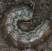 During crop emergence, look for thinning or bare areas of the field. Scout in the early morning or evening for cutworms feeding above-ground. At 10 sites in a field, count larvae in the top 2.5 cm (1 in) of topsoil in a 0.1 m2 (1 ft2) area.