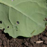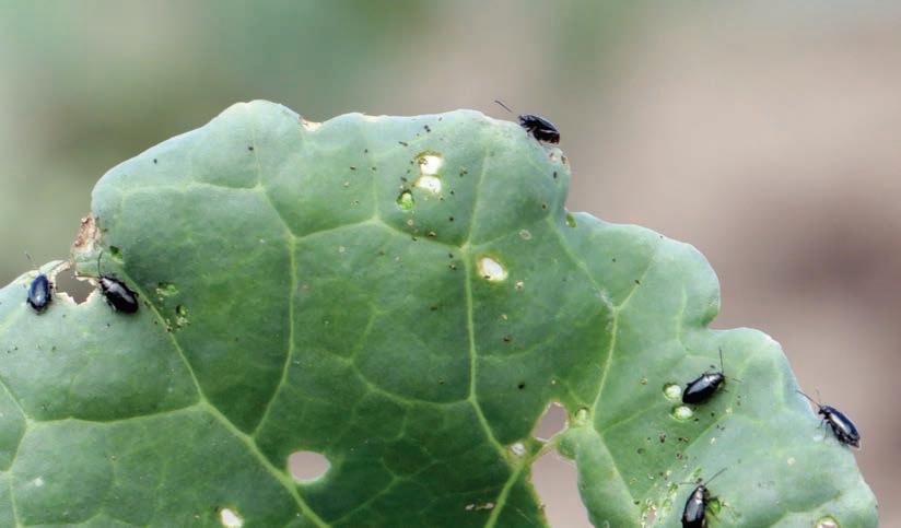 The action threshold is 25% leaf damage on cotyledons and adults are continuing to feed. Hot, dry conditions may require a lower threshold due to plants being under more stress and because flea beetles feed more actively under these conditions.