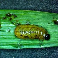 Larvae feed on upper surface of leaves, causing strips of damage. Crop yield and quality can be affected if flag leaf is damaged, but yield losses are highly variable and often negligible. Adults also feed on upper leaf surfaces but economic injury is from the larvae. Wheat, barley and oats are the most common host crops.