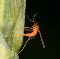 To prevent yield loss, the economic threshold is one adult midge per four to five heads. To prevent grade loss, an average of one adult midge per eight to 10 wheat heads is the threshold.