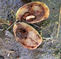 Females lay eggs in canola and brown mustard pods. The larvae feed on developing seeds causing infested pods to shatter or become distorted as the undamaged seeds mature. As the weevil emerges from a pod – the exit holes left allow fungal infections to set in and further reduce yield. Adults feed on developing flower buds, causing bud-blasting and can also be found feeding on pods in late canola crops.