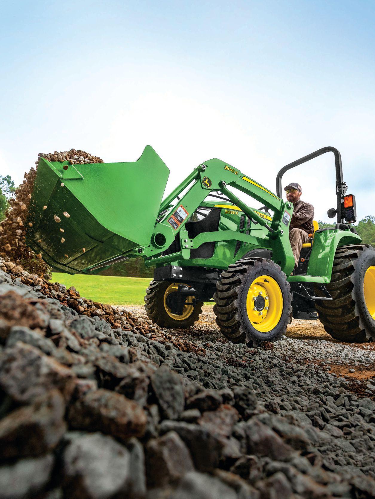Build water features. Move mulch. Dig drainage ditches. Plant a row of trees. Dump gravel. Run with us with a 25 HP* (18 kW), 32 HP (23 kW), or 38 HP (27 kW) 3E Compact Utility Tractor with an optional backhoe and a loader and really dig in. With all the attachments you can get, there’s really not much that you and your crew cannot do. The 44 in. (111.76 cm) turning radius is tight, so nothing will get in your way. Dig in with the mighty 3.