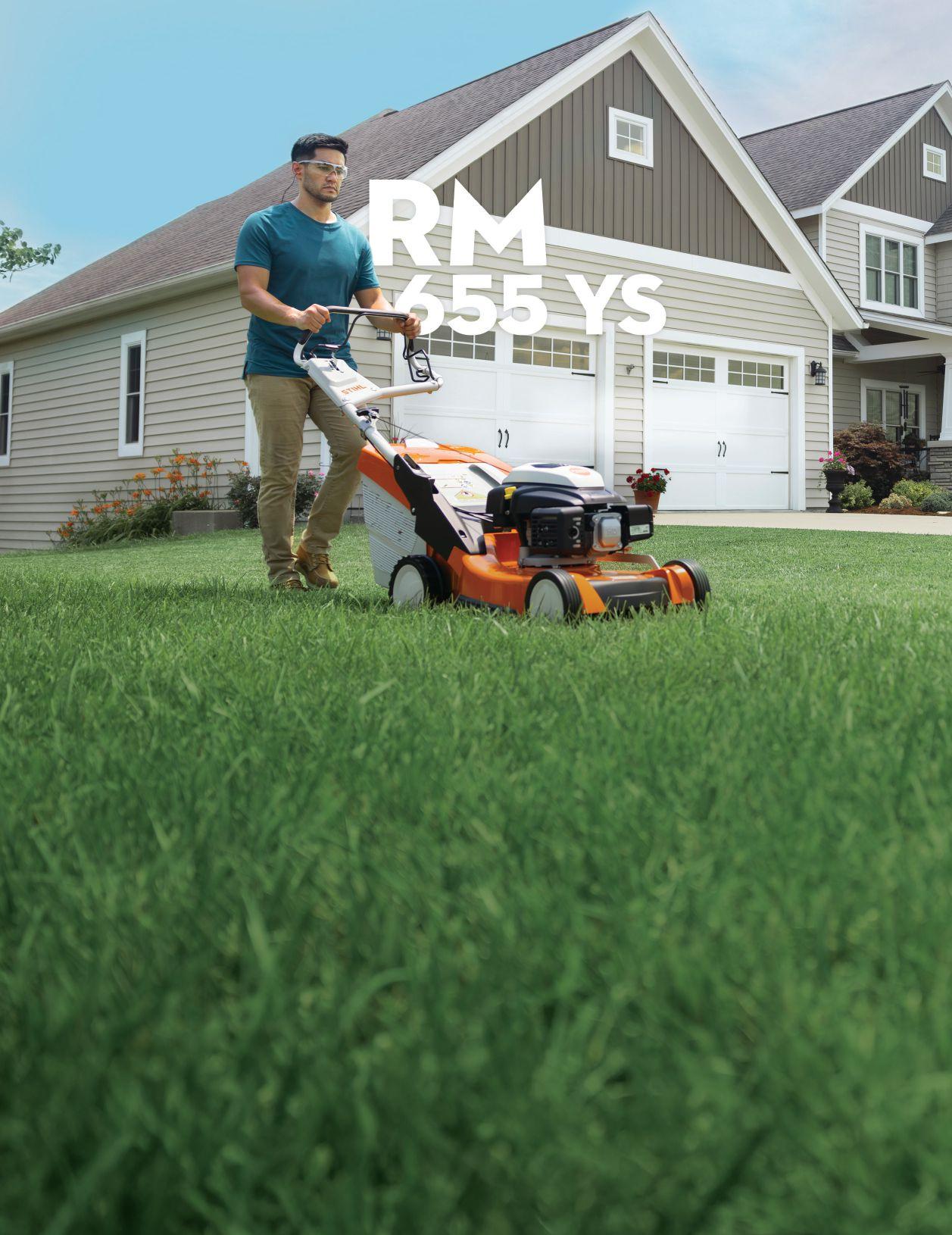 The RM 655 V self-propelled lawn mower gives homeowners the performance they expect from STIHL and the cut they desire with a 21" aluminum mowing deck, Vario drive, and a mono-comfort ergonomic handlebar.