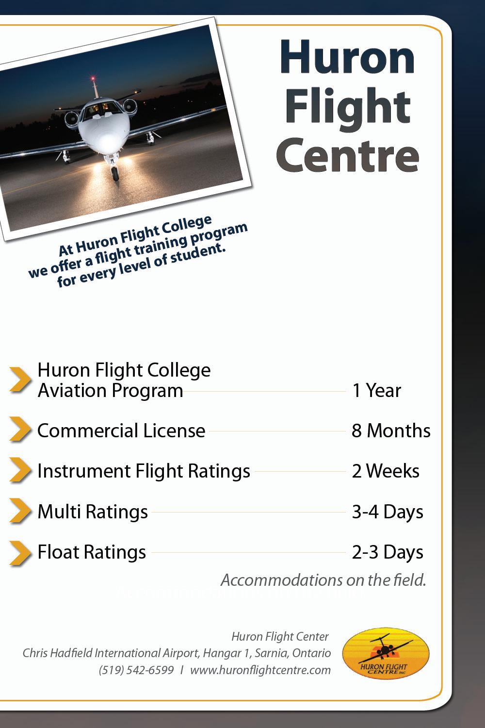 you to do just that. Its three-semester (optional fourth) Professional Aviation Program is designed to prepare students for entry-level positions in both the Canadian and international aviation industries. From CPL to Float Endorsement to Flight Dispatcher, the Huron Flight Centre does it all.