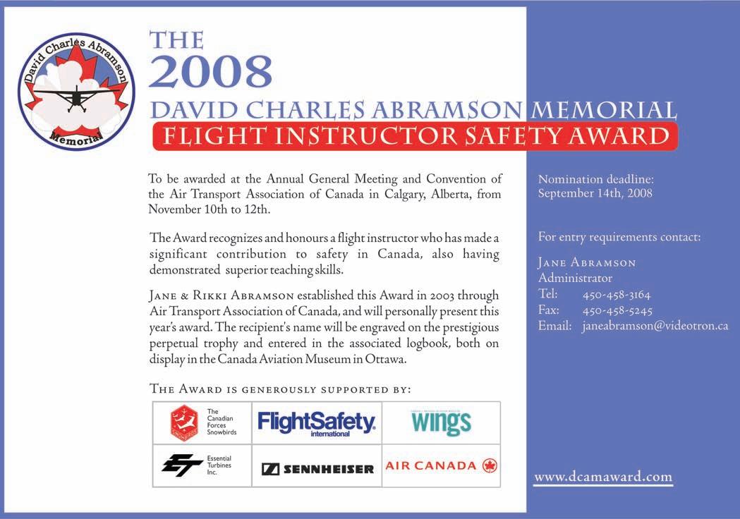 remain.” Since its inception in 2003, the DCAM Award has encompassed David’s passion for flight, safety consciousness and mentoring spirit by honouring five dedicated and distinguished instructors from various parts of Canada.