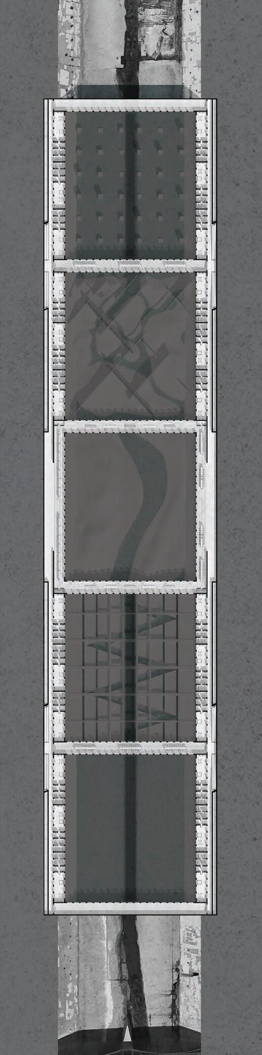 Unfold challenges the existence of itself and the nature of the LA River by turning inward. Embedded into the river embankment, the building has no openings to the surroundings besides the lobby entrances and disguises itself as part of the LA River channelization. By repeating the indoor spaces on a monolithic