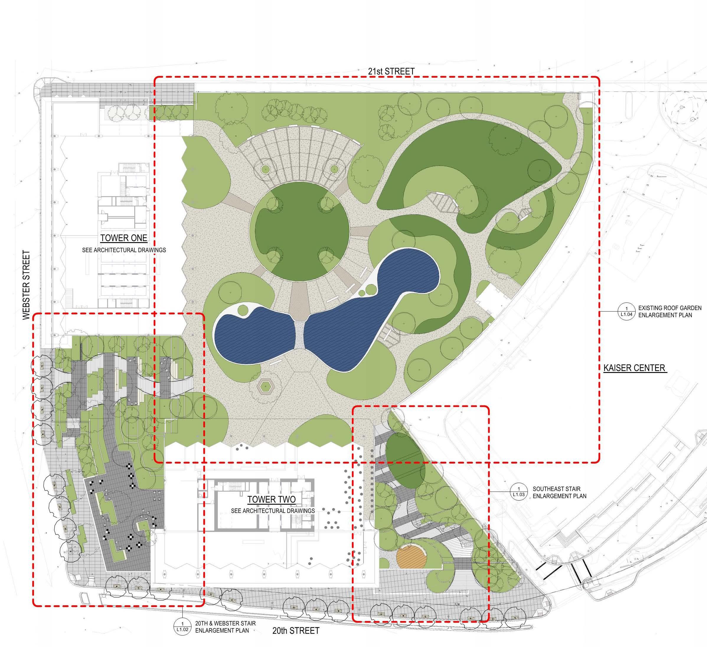 Project Information: The developer of the Kaiser Center is embarking on a project to expand the existing buildings while preserving the integrity of the original roof garden. The design approach entails seamlessly integrating new expansions adjacent to the existing structures, with a keen focus on retaining the essence of the rooftop oasis. Furthermore, the project aims to enhance connectivity by re-purposing the staircase space as an additional urban gathering area, effectively bridging the rooftop garden with the ground level.