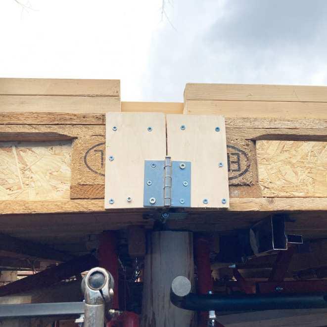 Dass die beiden H‰lften des Tiny House gemeinsam auf dem Boden stehen, wird durch die an beiden Teilen der Unterkonstruktion befestigten OSB-Platten, die Kulissenscharniere und die Holzst‰mme, die beide Teile gleichzeitig abst¸tzen, gew‰hrleistet.