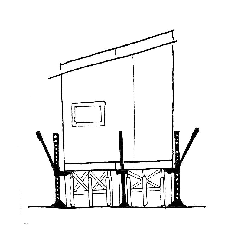 Vergleichder Aussteifungselemente, die die Fahrr‰dergegen das Gewicht desTiny House (horizontale Belastung) und die Windlast (vertikale Belastung) sichern.