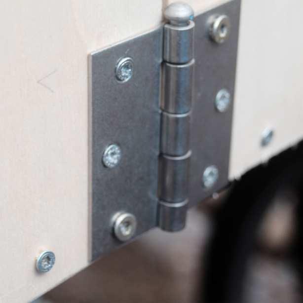 Dass die beiden H‰lften des Tiny House gemeinsam auf dem Boden stehen, wird durch die an beiden Teilen der Unterkonstruktion befestigten OSB-Platten, die Kulissenscharniere und die Holzst‰mme, die beide Teile gleichzeitig abst¸tzen, gew‰hrleistet.