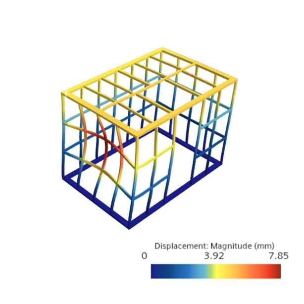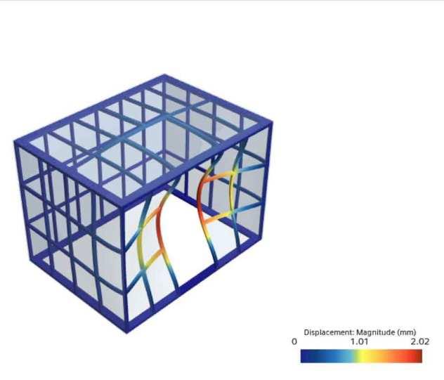 Pr¸fung des Windwiderstands der geplanten Wand. Abb. 1 zeigt die Verformung der R¸ckwand ohne OSBPlatte. Abb. 2 zeigt die Ver-formung der Stirnwand ohne OSB-Platte. Abb. 3 zeigt die Verformung der Stirnwand mit OSB-Platte. Die maximale Verformung verringert sich von 12,9 mm auf 2,02 mm. Bei Wandverkleidungen mit OSBPlatten bestehen keine Bedenken hinsichtlich der Windlasten.