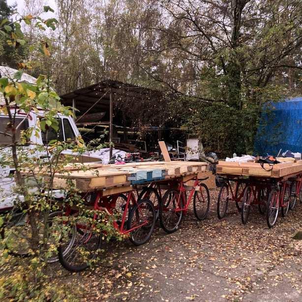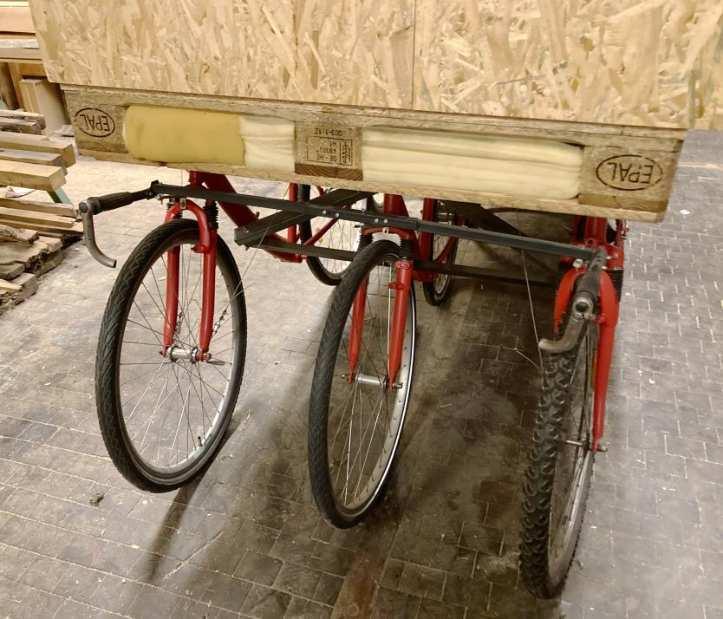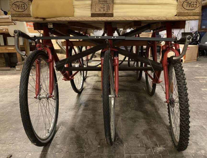 Drei aussenseitig befindliche Vorderr‰dder wurden auf beiden Seiten mit Lencker durch L-fˆrmigen rechtwinkligen Halterungen verbunden, so, dass die Fahrr‰der sich gleichzeitig gelenkt werden kˆnnen. Die Untenkonstruktion wurde nach drauflen gebracht.