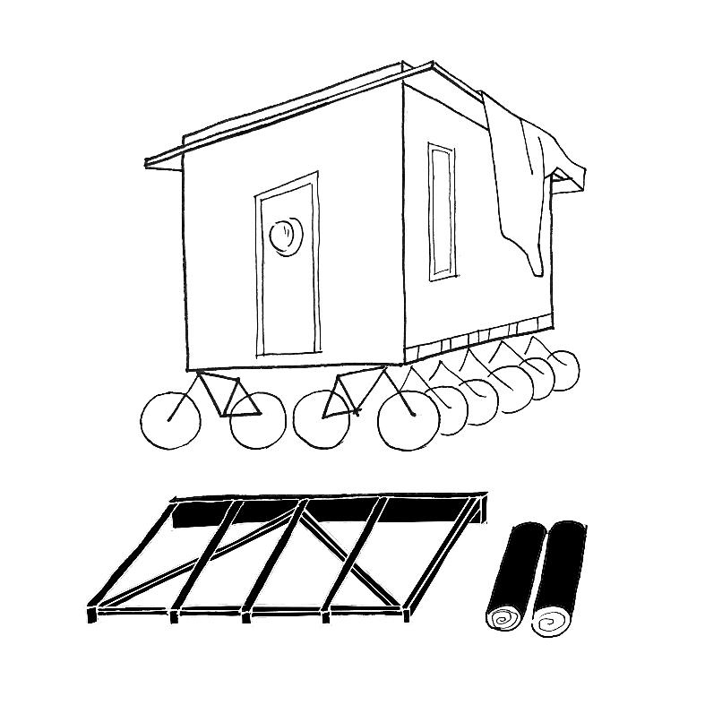In Deutschland ist es ¸blich, Gegenst‰nde an die Haust¸r zu stellen, um sie zu verschenken. F¸r das Projekt "Mobiles Haus" wurden viele Materialien verwendet, die auf der Strafle gefunden wurden, z.B. Matratzen als D‰mmung, Europaletten, Mˆbel etc.