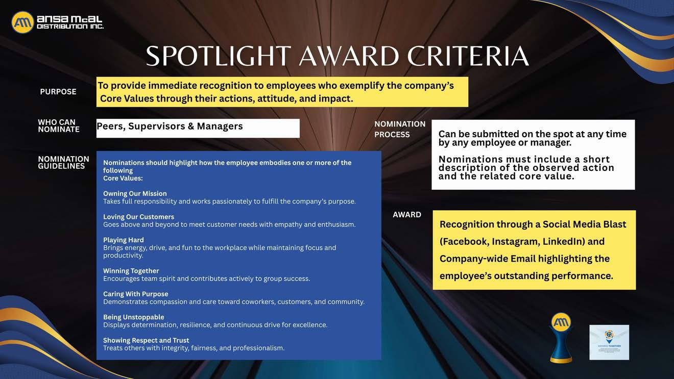 The AMDI Spotlight Award was established to honor employees fortheirhardworkandcommitment.Thisrecognitionoccursin two parts: employees can receive immediate acknowledgment foraspecifictaskthey'vecompleted,ortheymaybeselectedas EmployeeoftheMonthbytheirsupervisorormanager.
