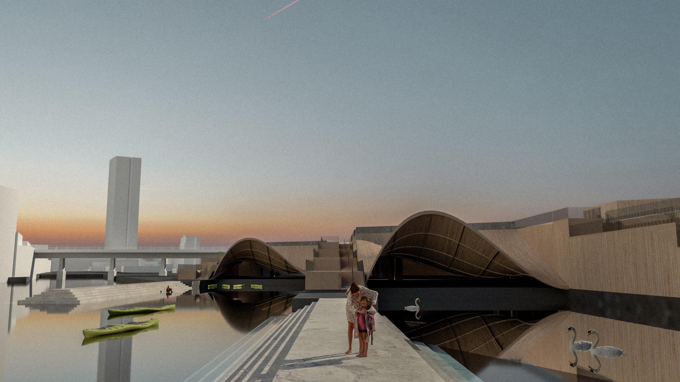 London’s logistics network is failing due to its heavy reliance on road-based transport, leading to congestion and environmental issues. The solution is simple: to reconsider an oftenoverlooked asset within the city — the canal system. Centred on a masterplan along the Lee Navigation in East London, the project proposes a main logistics centre that integrates water, road, and rail freight, supported by smaller micro-hubs to form a cohesive logistics network for the construction industry. The network operates as an efficient loop, with barges delivering construction materials then returning with site waste. The project targets to reactivate the canals not only as gentrified leisure spaces but back to their original function, as waterways that contribute to a more liveable and resilient city.