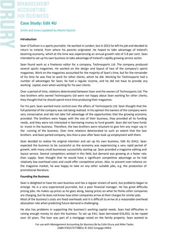 Case Study: Edit 4U Smith and Jones (updated by Martin Quinn) Introduction Sean O’Sullivan is a sports journalist. He worked in London, but in 2015 he left his job and decided to return to Ireland, from where his parents originated. He hoped to take advantage of Ireland’s booming economy, which at the time was experiencing an annual growth rate of 5-8 per cent. Sean intended to set up his own business to take advantage of Ireland’s rapidly growing service sector. Sean found work as a freelance editor for a company, Technosports Ltd. The company produced several sports magazines. He worked on the design and layout of two of the company’s sports magazines. Work on the magazines accounted for the majority of Sean’s time, but for the remainder of his time he was free to work for other clients, which he did. Working for Technosports had a number of advantages for Sean; he had a regular income, and he did not have to provide any working capital, even when working for his own clients. Over a period of time, relations deteriorated between Sean and the owners of Technosports Ltd. The two brothers who owned Technosports Ltd were not happy about Sean working for other clients; they thought that he should spend more time producing their magazines. For his part, Sean wanted more control over the affairs of Technosports Ltd. Sean thought that the full potential of the company was not being realized. In his opinion the owners of the company were very conservative and did not take full advantage of the opportunities that the growing economy provided. The brothers were happy with the size of their business, they provided all its funding needs, and they were not interested in borrowing money to fund growth. Sean did not have funds to invest in the business. Therefore, the two brothers were reluctant to give him any major say in the running of the business. Over time relations deteriorated to such an extent that the two brothers and Sean parted company, less than a year after Sean took up employment with them. Sean decided to realize his original intention and set up his own business, Edit 4U (E4U). Sean expected the business to be successful as the economy was experiencing a very rapid period of growth, with many small businesses successfully starting up. Sean provided a magazine editing and layout service. Several competitors existed in this field, but demand was growing at a faster rate than supply. Sean thought that he would have a significant competitive advantage as he had relatively low overhead costs and could offer competitive prices. Also, to prevent over-reliance on the magazine market, he was happy to take on any other suitable jobs, e.g. the production of promotional literature. Founding the Business Sean is delighted to have his own business and has a regular stream of work, but problems began to emerge. He is a very experienced journalist, but a poor financial manager. He has great difficulty pricing jobs. He makes up prices as he goes along, basing prices on what he thinks other companies are charging, but he does not know how other companies arrive at their charges for similar jobs. Most of the business’s costs are fixed overheads and it is difficult to arrive at a reasonable overhead absorption rate when predicting future demand is challenging. He also has problems in supporting the business’s working capital needs. Sean had difficulties in raising enough money to start the business. To set up E4U, Sean borrowed €16,452, to be repaid over 10 years. The loan was part of a mortgage raised on the family property. Sean wanted to For use with Management Accounting for Business 8e by Colin Drury and Mike Tayles (ISBN 9781473778801) © 2022 Cengage EMEA