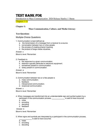 Test Bank For Introduction to Mass Communication 2026 Release Stanley J. Baran Chapters 1-15 Chapter 1: Mass Communication, Culture, and Media Literacy Test Questions Multiple-Choice Questions 1. Communication is best defined as a. the transmission of a message from a receiver to a source. b. conversation between two or a few people. c. the process of creating shared meaning. d. the product of large media industries. Answer: c Bloom‘s level: Remember 2. Feedback is a. the response to a given communication. b. distortion typically attributed to electronic equipment. c. sometimes present in communication. d. rarely present in communication. Answer: a Bloom‘s level: Remember 3. Communication between two or a few people is a. mass communication. b. feedback. c. interpersonal communication. d. reciprocal communication. Answer: c Bloom‘s level: Remember 4. When messages are transformed into an understandable sign and symbol system by a participant in the communication process, _____________ is said to have occurred. a. noise b. encoding c. decoding d. feedback Answer: b Bloom‘s level: Remember 5. When signs and symbols are interpreted by a participant in the communication process, _____________ is said to have occurred. a. noise b. encoding c. decoding
