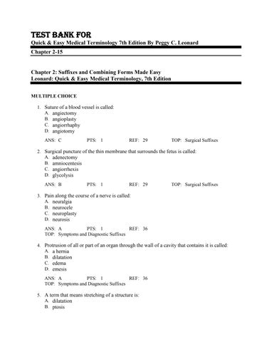 Chapter 2: Suffixes and Combining Forms Made Easy Leonard: Quick & Easy Medical Terminology, 7th Edition MULTIPLE CHOICE 1. Suture of a blood vessel is called: A. angiectomy B. angioplasty C. angiorrhaphy D. angiotomy ANS: C