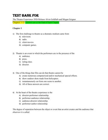 Test Bank For The Theatre Experience 2026 Release Alvin Goldfarb and Megan Geigner Chapters 1-13 Answers are at the End of Each Chapter Chapter 1 1) The first challenge to theatre as a dramatic medium came from A) television. B) radio. C) silent movies. D) computer games.