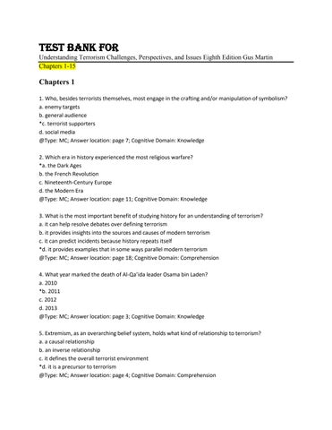 Chapters 1 1. Who, besides terrorists themselves, most engage in the crafting and/or manipulation of symbolism? a. enemy targets b. general audience *c. terrorist supporters d. social media @Type: MC; Answer location: page 7; Cognitive Domain: Knowledge 2. Which era in history experienced the most religious warfare? *a. the Dark Ages b. the French Revolution c. Nineteenth-Century Europe d. the Modern Era @Type: MC; Answer location: page 11; Cognitive Domain: Knowledge 3. What is the most important benefit of studying history for an understanding of terrorism? a. it can help resolve debates over defining terrorism b. it provides insights into the sources and causes of modern terrorism c. it can predict incidents because history repeats itself *d. it provides examples that in some ways parallel modern terrorism @Type: MC; Answer location: page 18; Cognitive Domain: Comprehension 4. What year marked the death of Al-Qa’ida leader Osama bin Laden? a. 2010 *b. 2011 c. 2012 d. 2013 @Type: MC; Answer location: page 3; Cognitive Domain: Knowledge 5. Extremism, as an overarching belief system, holds what kind of relationship to terrorism? a. a causal relationship b. an inverse relationship c. it defines the overall terrorist environment *d. it is a precursor to terrorism @Type: MC; Answer location: page 4; Cognitive Domain: Comprehension