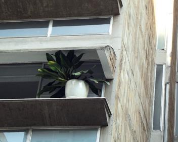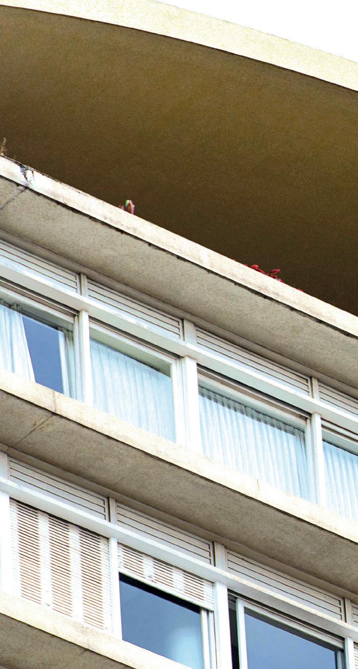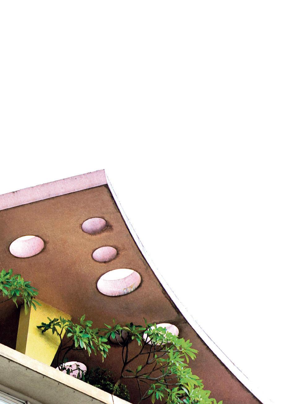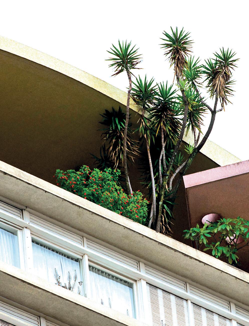 on the street front in favor of a deeper development of the buildings, altering their relationship with urban space according to three locations: the main front parallel to the street; a narrow side facing the street with longitudinal crossing of the plot; an L-shaped building with one long and one short side at the rear of the plot. The solution of the parallel double body is used as an alternative to the single L-shaped body with different urban enhancement effectiveness (in the Louveira, it allows the creation of an internal courtyard with a garden that extends the tree-lined square in front). An element of extraordinary importance in the attachment to the ground of Higienópolis condominiums is the landscape component. Where the plot allowed, environmental design became an opportunity for the creation of gardens and parks, with pools or artificial lakes and tropical vegetation, where residents and neighbourhood inhabitants could benefit from shade, coolness, and colors drawn from the Atlantic Forest. Another element of the Louveira’s tectonics and other São Paulo condominiums is the “Ideal” window, composed of a thin metal frame and horizontal or vertical sliding blinds with symmetrical operation thanks to a counterweight mechanism. When fully opened, the blinds cover the red panels of the Louveira’s facade, making the facade all yellow cut by pearl grey string courses. The insertion of an oblique glass wall opening onto a closed loggia creates an effect of extroversion and illumination that emphasizes the relationship between indoor and outdoor environments. In the architecture of the 1930s-1960s, rooftop terraces initially welcomed penthouses and technical volumes, then collective spaces with gardens, party halls, and belvederes. In the Louveira, the skyward attack is still compact, with a line that tightens a stereometric volume towards the main facade, but other architects (especially João Artacho Jurado) have shaped the skyward attacks of their buildings according to recognizable profiles, making them iconic features of the São Paulo skyline. The space between the roof slab and the sky becomes a place of suspension between daily life and leisure, hosting pools and solariums, places of leisure and relax.