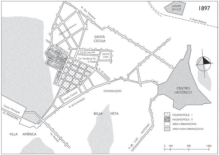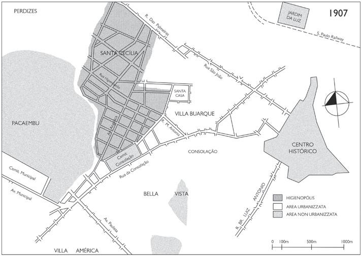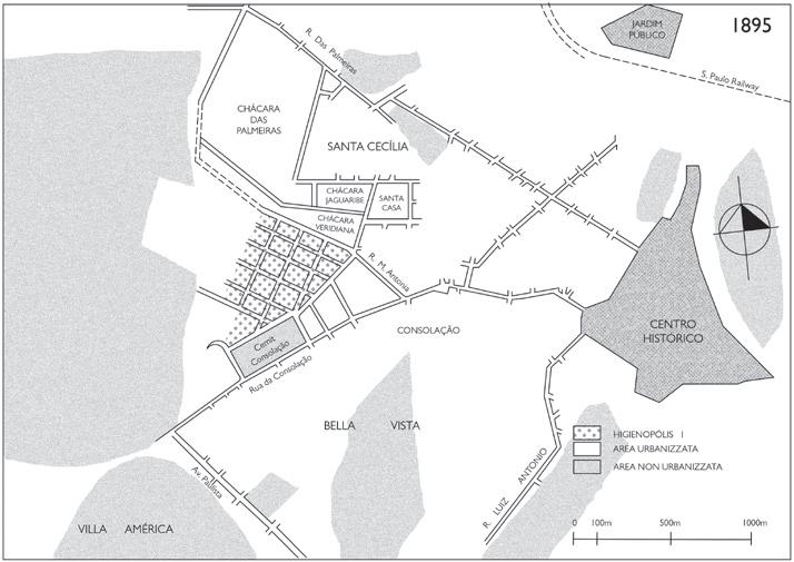 spazio libero da destinare a giardini e spazio pubblico. D’altro canto Riciputo descrive Higienópolis come ibridazione tra il modello della città giardino di Ebenezer Howard – che attraverso gli Stati Uniti venne adottata per la pianificazione dei nuovi quartieri medio-alti di São Paulo – e la visione lecorbuseriana della città moderna confluita in un impianto in cui la piazza posta sul culmine della collina e cuore centrale del quartiere, la Praça Buenos Aires, è in realtà un lussureggiante giardino e un belvedere. Sostanzialmente Higienópolis si configura come una enclave dove sono declinati i principi dell’abitare suburbano in un contesto urbano con tutti i vantaggi che questo comporta: tranquillità, salubrità e piacevolezza della città giardino in case di ampia metratura e dotate di tutti i comfort ambientali insieme alla vicinanza al centro città e a tutti i suoi servizi. D’altro canto non è un dettaglio trascurabile che la pianificazione dei nuovi quartieri fosse nelle mani di imprenditori privati ed è un fatto dirimente che il progetto urbano della città fosse opera delle imprese di costruzione e non dell’ufficio pubblico della pianificazione, di fatto inesistente.