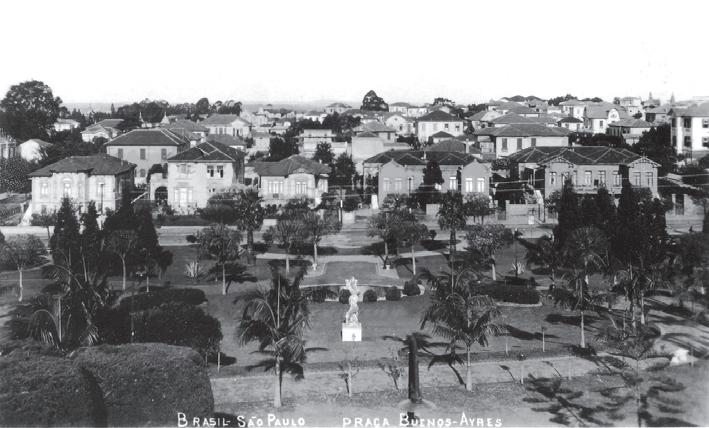 9 L’esproprio delle terre per la realizzazione della piazza è stato autorizzato con la Legge municipale n. 1626 del 29 novembre 1912. La piazza è stata registrata con l’Atto municipale n. 538 del 20 maggio 1913 come Praça Higienópolis. Nello stesso anno, con la Legge n. 1743 del 18 settembre, la piazza viene rinominata Praça Buenos Aires e vengono assegnati i nomi alle nuove strade che stanno sorgendo nel quartiere. Il cambio di nome viene attribuito allo stesso Duprat come omaggio a una delegazione politica porteña venuta in visita nel 1913, come riporta il Correio Paulistano in un articolo di politica estera del 5 ottobre (D’Elboux 2015, 518).
