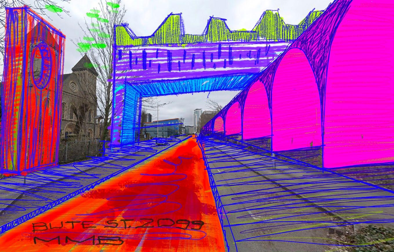 The Paper Folder is a visual narrative series that imagines radical urban interventions in Cardiff and Pontypridd, set in a near future shaped by ecological and social reconnection. Across five short comics (Living Bridge, Urban Moat, Rooftop Meadows, Edible Lanes, Pollinator Paths), we follow a character inspired by the artist himself: a quiet observer and maker who walks the city, releasing folded forms; a paper boat, a plane, a crane, into reimagined spaces where infrastructure, nature, and memory coalesce. These regenerative interventions propose a future where bridges become habitats, moats civic stages and water play, and rooftops wild meadows. Informed by speculative design and post-industrial rewilding, each vignette explores how design can reconnect people with place. The narratives are deliberately modest: rain falls, streets glisten, quiet mornings invite reflection. Through the metaphor of paper, delicate yet intentional, the artworks suggest that cities, too, can be refolded. The project reflects on Calvino’s assertion that “the city does not say its past,” yet holds it in every carved and gridded line. The Paper Folder sees the city not only as archive but as ongoing origami: once folded, even when unfolded, creases, traces of its past remain. It asks: what if we designed for belonging, biodiversity, and wonder?