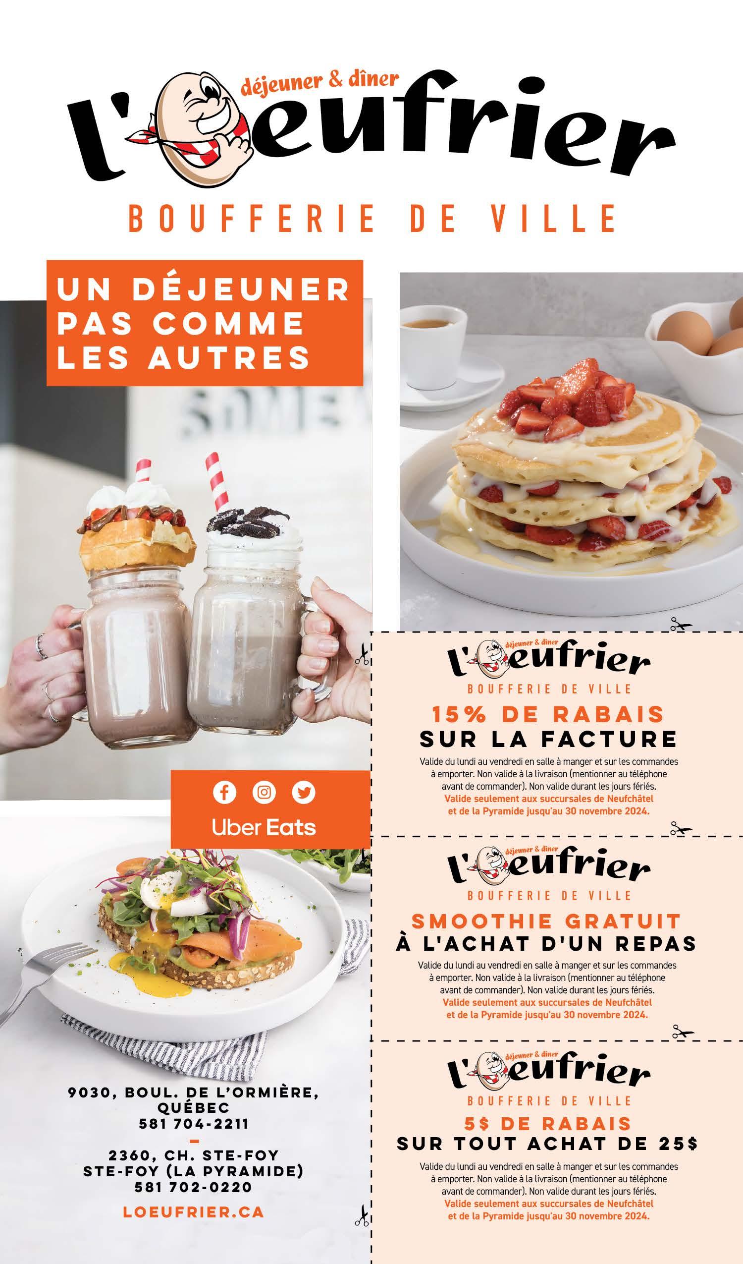 *Un rabais par facture. Ne peut être jumelé à aucune autre offre spéciale et boissons alcoolisées. Mentionnez cette offre lorsque présentez votre coupon lors du