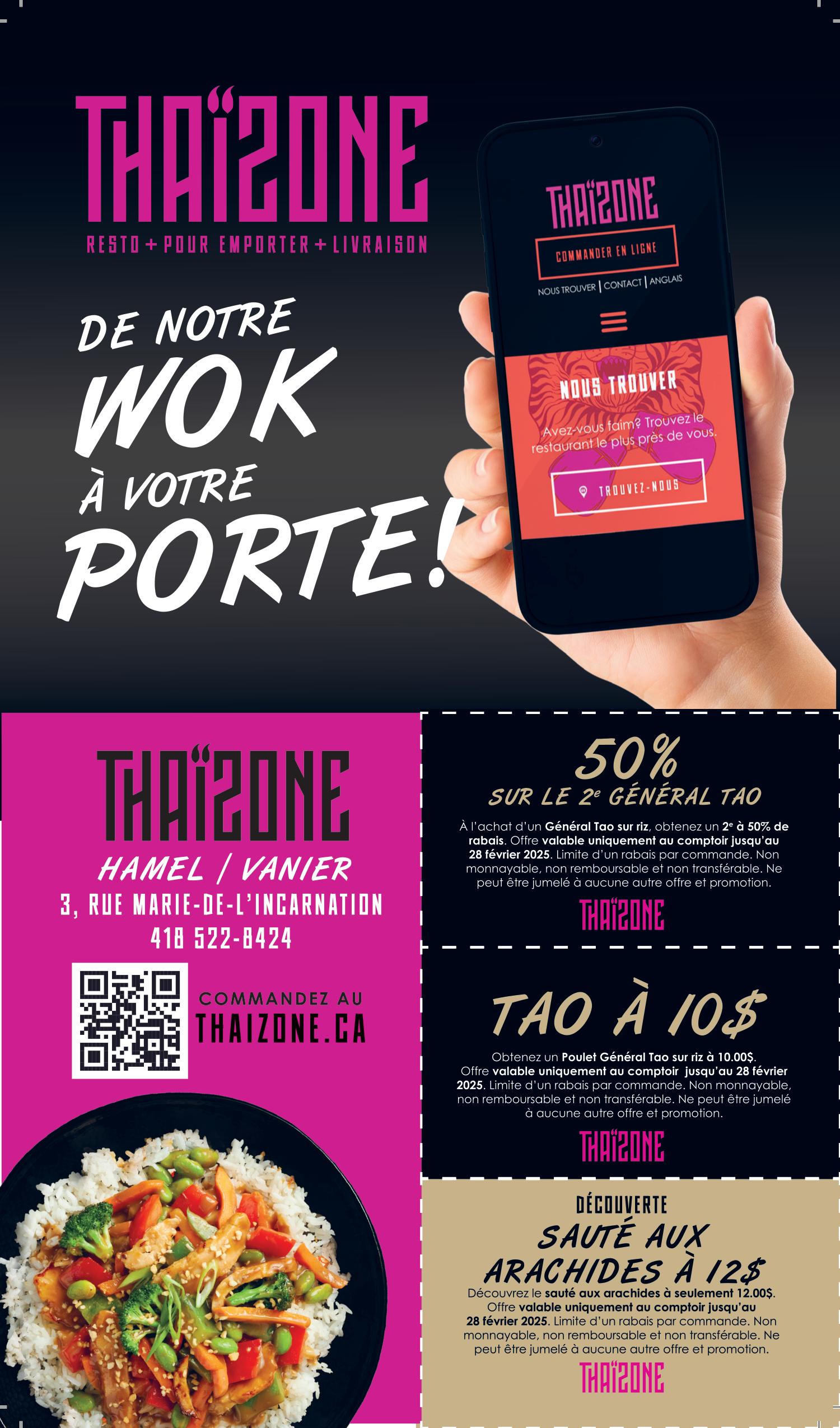 *Un coupon par client. Ne peut ĂȘtre combinĂ© Ă aucune autre offre. Applicable sur le repas de valeur Ă©gale ou moindre. Valide aux ThaĂŻ Express 440, rue de la Couronne seulement. Valide Ă la salle Ă manger et au comptoir seulement. Date dâexpiration :
