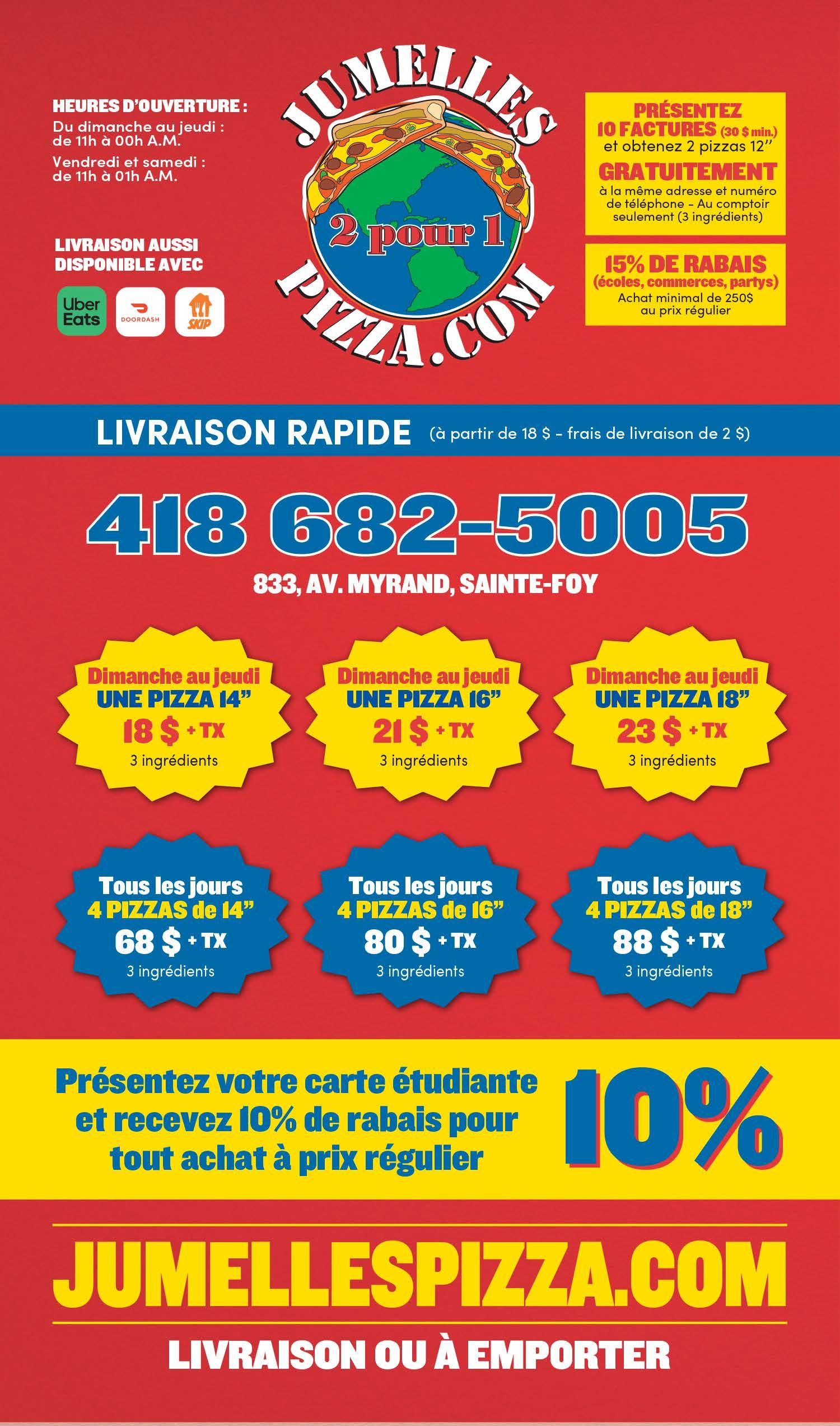 *Un rabais par facture. Ne peut ĂȘtre jumelĂ© Ă aucune autre offre spĂ©ciale et boissons alcoolisĂ©es. Mentionnez cette offre lorsque prĂ©sentez votre coupon lors du
