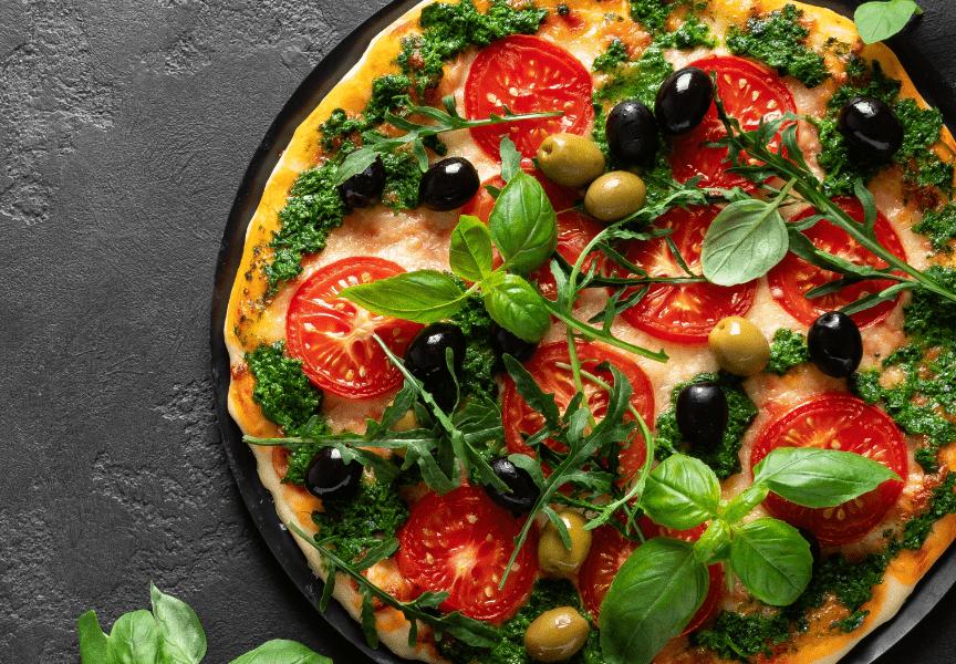 Poivrons verts, champignons, fromage mozzarella, feta, olives noires et vertes