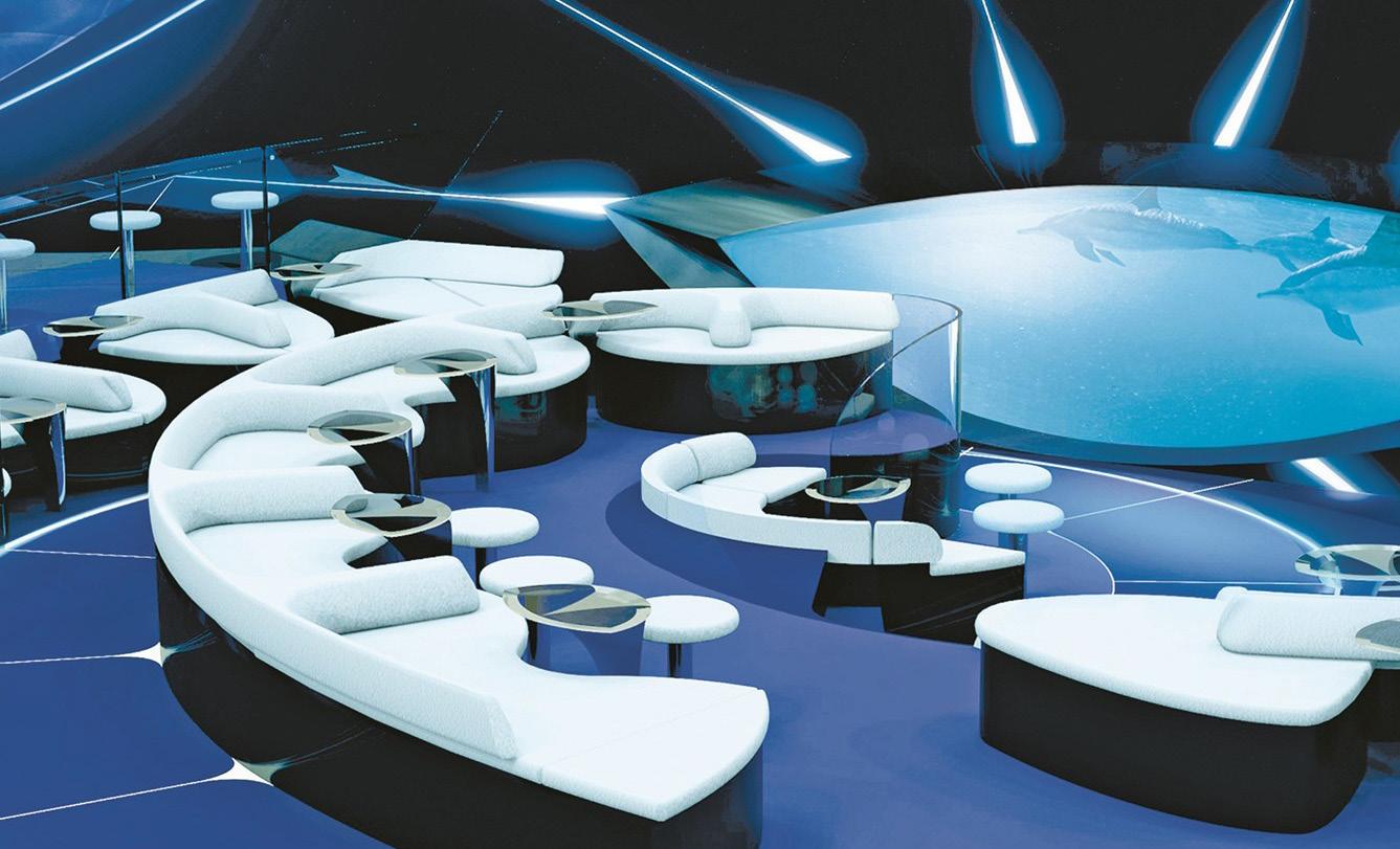 Le salon sous-marin Blue Eye du navire Lapérouse est situé au sein de la coque, sous la ligne de flottaison. Depuis cet espace au design évoquant les cétacés et les méduses, les passagers pourront observer la faune et la flore de l’univers subaquatique et découvrir ses sonorités. <
