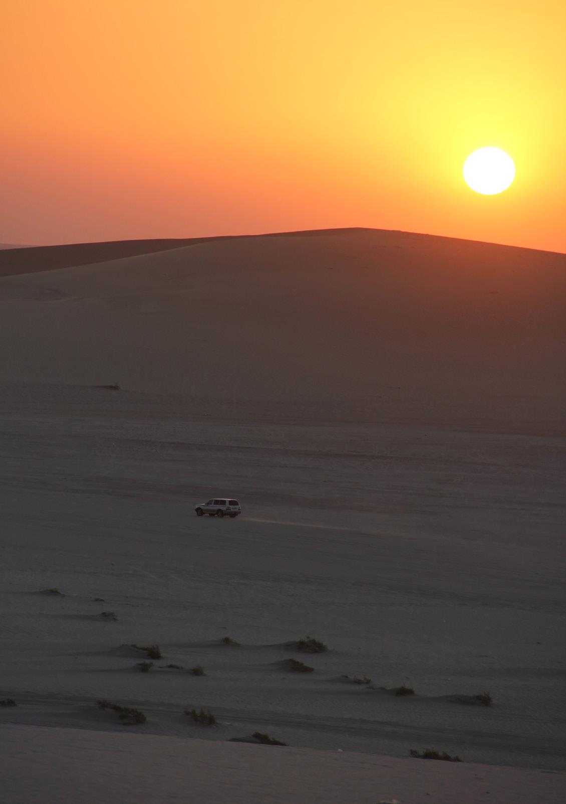 Mais les paysages deviennent encore plus spectaculaires au fur et à mesure que le soleil se couche, la lumière orangée faisant ressortir encore davantage les « vagues » de sable qui cascadent sur les dunes, poussées par le vent. Souvent, ces excursions se terminent sur les rives de Khor Al Daid (qu'on appelle la « mer intérieure »), pour un souper BBQ, voire une nuitée dans le désert, dans un campement de tentes bédouines. Qatar Airways dessert le Qatar et plus d’une centaine d'autres destinations, dont le Kenya.