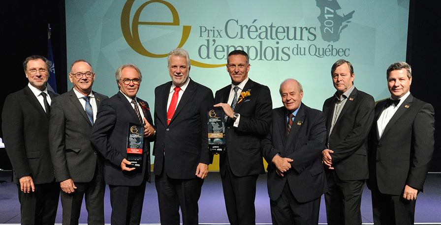 Yves-Thomas Dorval, CPQ; Louis-Marie Beaulieu, Groupe Desgagnés; Claude Trottier, Canards du Lac Brome, Grand prix Coup de cœur et Créateur de prospérité du Québec; Philippe Couillard, premier ministre du Québec; Paul Raymond, Groupe Alithya, Grand prix Créateurs d’emplois et de prospérité du Québec; Léopold Beaulieu, Fondaction; Pierre Dolbec, président, CPIQ; et Pierre Cassivi, fondateur et PDG des Prix Créateurs d’emplois du Québec.